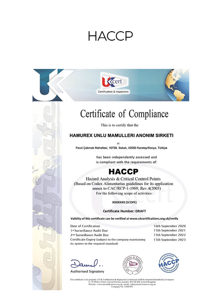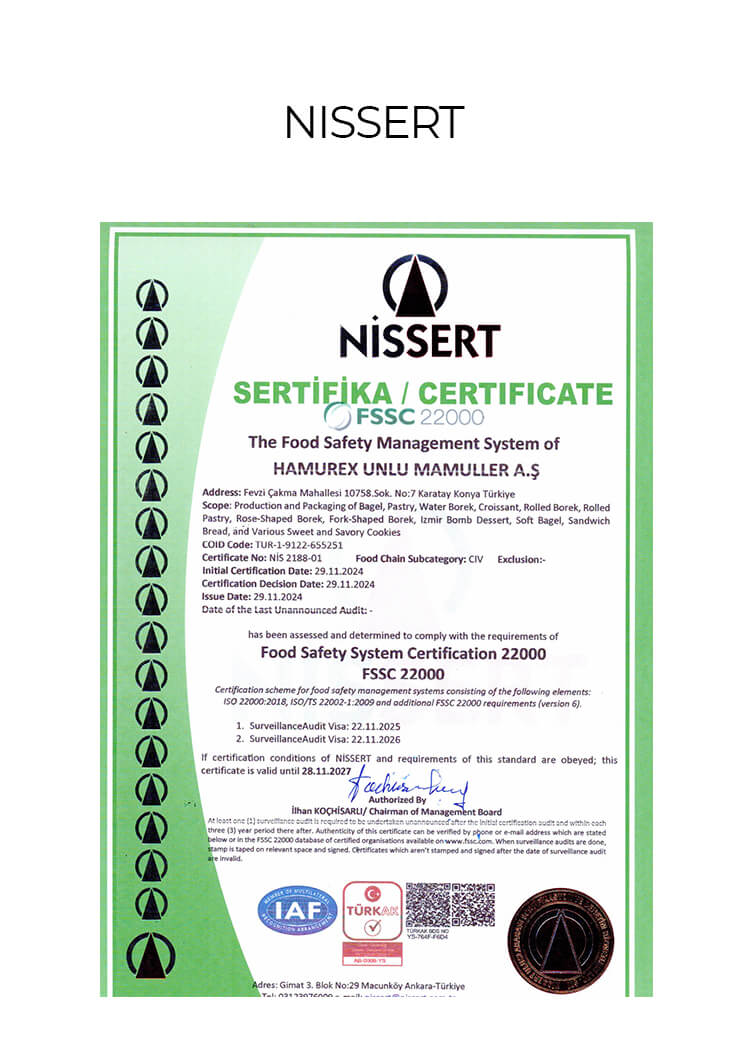 Fabrikamız, BRC Food, Helal Belgesi, ISO 9001, ISO 22000 ve marka tescil belgelerine sahiptir. Ayrıca üretimde kullandığımız bütün hammaddelerimizin helal sertifikası vardır. Üretimimizin en kritik noktalarından birisi soğuk zincirin korunması ve devamlılığıdır. Soğuk zincirin korunması için -40 derecede şoklanan ürünler yine -40 derece olan sevkiyat soğuk hava deposuna alınır ve sevkiyatı yapılır. Ürünlerin sevkiyatı -18 derece olan frigolu araçlarla gerçekleşir. Şubelerimizde de -18 derece olan soğuk hava depolarında muhafaza işlemi yapılmaktadır.